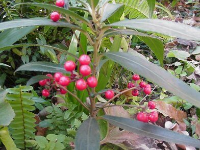 センリョウや、マンリョウは有名ですが、このカラタチバナはほとんど知られていないものです。しかし、晩秋から冬の花のほとんど見られない時期にこのように、冬中赤い実をつけて私たちの目を楽しませてくれます。