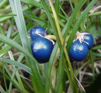 この美しいブルーの種をつける植物は、その葉が、幅は数ミリと細く、長さは10~20cm であるために、ジャノヒゲ(蛇のヒゲ)とか、リュウノヒゲという名前がついています。しかし、その名のイメージとは異なって、冬のさなかであっても、このような目の覚めるような青い色の種をその草陰に保っています。これは実のようにみえますが、種皮が脱落した種なのです。