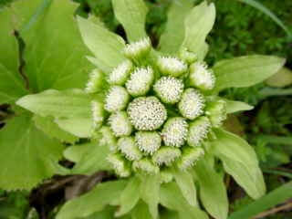 写真にみられる、フキの若い花茎(かけい)をフキノトウといい、葉柄とともに食用、薬用に用いられます。若いフキノトウはみそ汁などに入れると独特の春の野の香りと味わいがあって、好む人も多いようです。