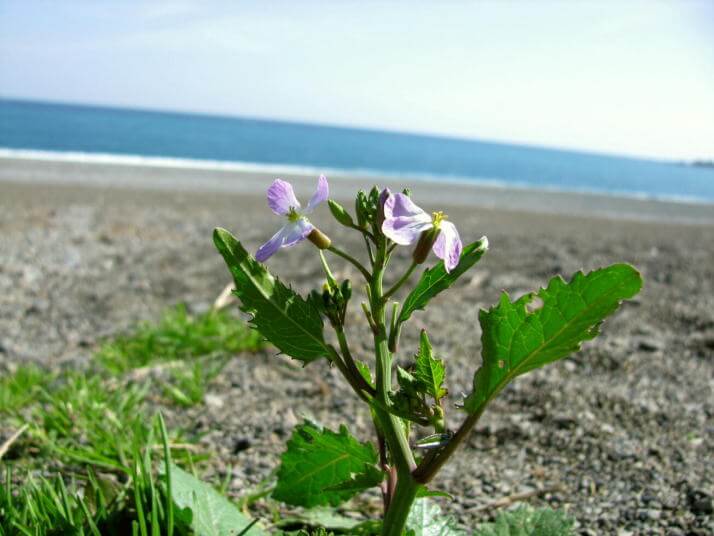 この植物は、徳島県南部の高知県境に近いところにある、2キロ余りも続く広大な海岸にて見出したものです。遠景の海は、太平洋です。月に一度の小集会のために訪問した帰りでの撮影です。この日は、久しぶりの青空のもと、誰一人いない美しい砂浜の広がるところに、今年初めて咲き始めたハマダイコンがあったのです。まだ春先なので20センチほどの高さで、花びらは淡い紅紫色の美しいものです。この植物は、海岸に力強く打ち寄せる波を見つめ、その波音に聞き入りながら花を咲かせている感じがしました。