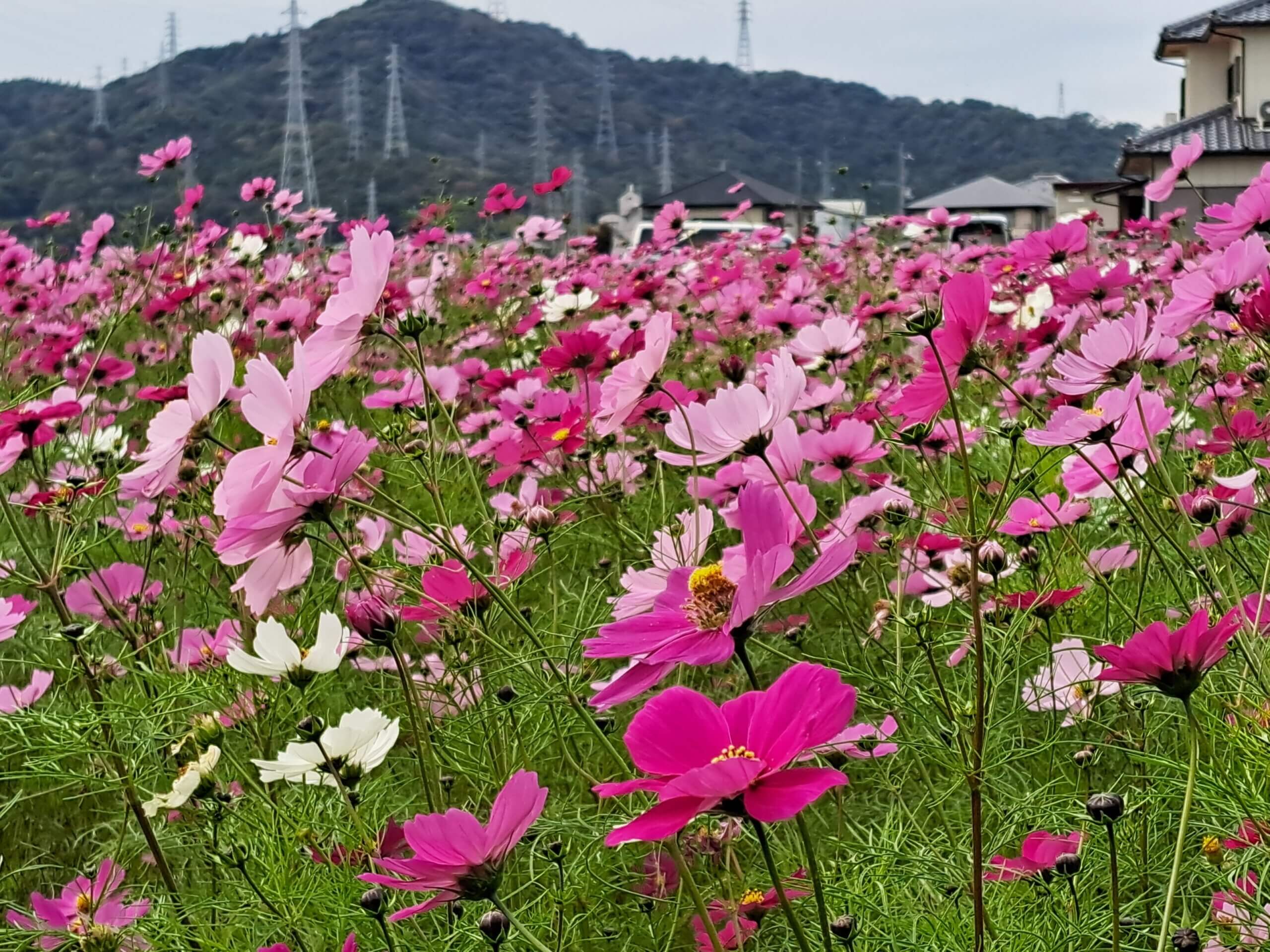 稲刈りの終わった後の田が、コスモス畑に。きれいです。