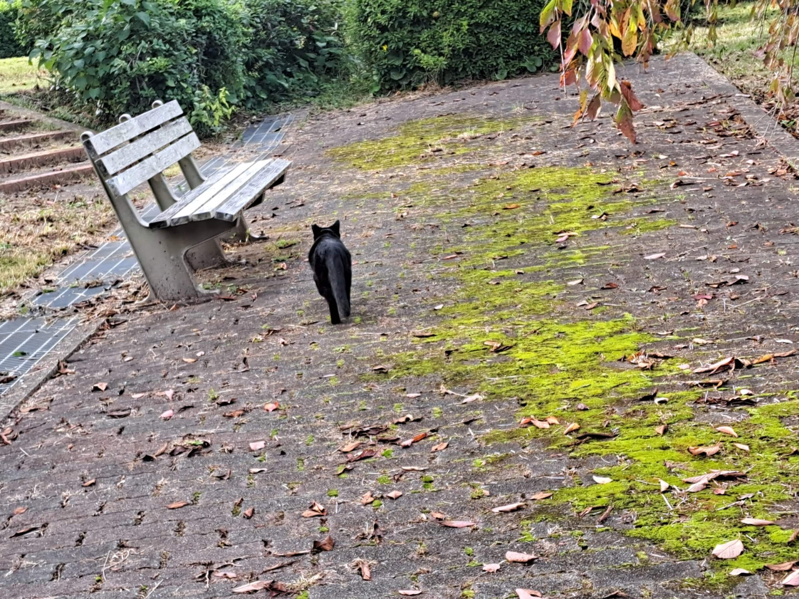公園のベンチの前を、そっと歩くクロネコ。何を思っているのかな。